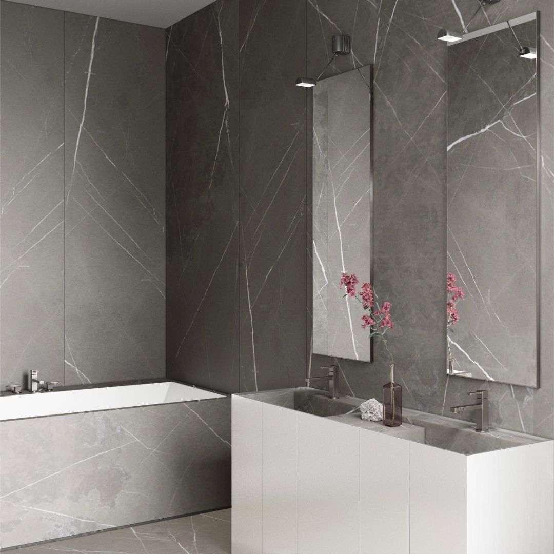 мрамором Pietra Grey, установлен санфаянс Gessie и Villeroy&Boch.