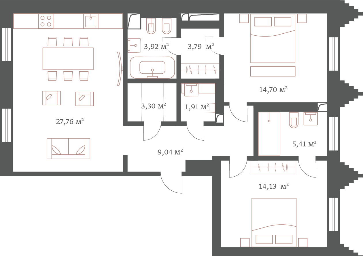 В апартаменте продуманная планировка: хозяйская мастер-спальня площадью 22 м²с отдельной гардеробной и ванной комнатой,